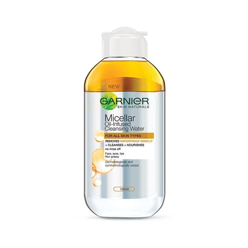 Garnier Micellar Oil Infused Cleansing Water combines micellar technology with nourishing argan oil to effectively cleanse and remove makeup without rubbing or rinsing. It leaves skin feeling clean, hydrated, and refreshed.